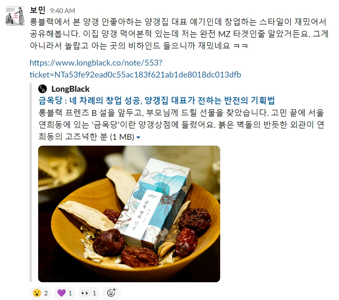 물론 콘텐츠 그 자체에 빠져들어 충분히 즐기기도 했습니다. '묘사의 힘 : 독자가 내 글 속에서 살아 숨쉬게 하는 법’, ‘뉴욕타임스 편집장의 글을 잘 쓰는 법 : 팩트만으로는 설득할 수 없다’와 같은 글쓰기 방법론을 주제로 하는 콘텐츠들은 제가 그간 써왔던 글들을 다시 돌아보는 계기가 되어주기도 했고요. ‘금옥당 : 네 차례의 창업 성공, 양갱집 대표가 전하는 반전의 기획법’처럼 재미있는 창업자 이야기는 데이터리안 멤버들에게 공유해서 함께 돌려보고 이야기를 나누는 계기가 되기도 했습니다.
