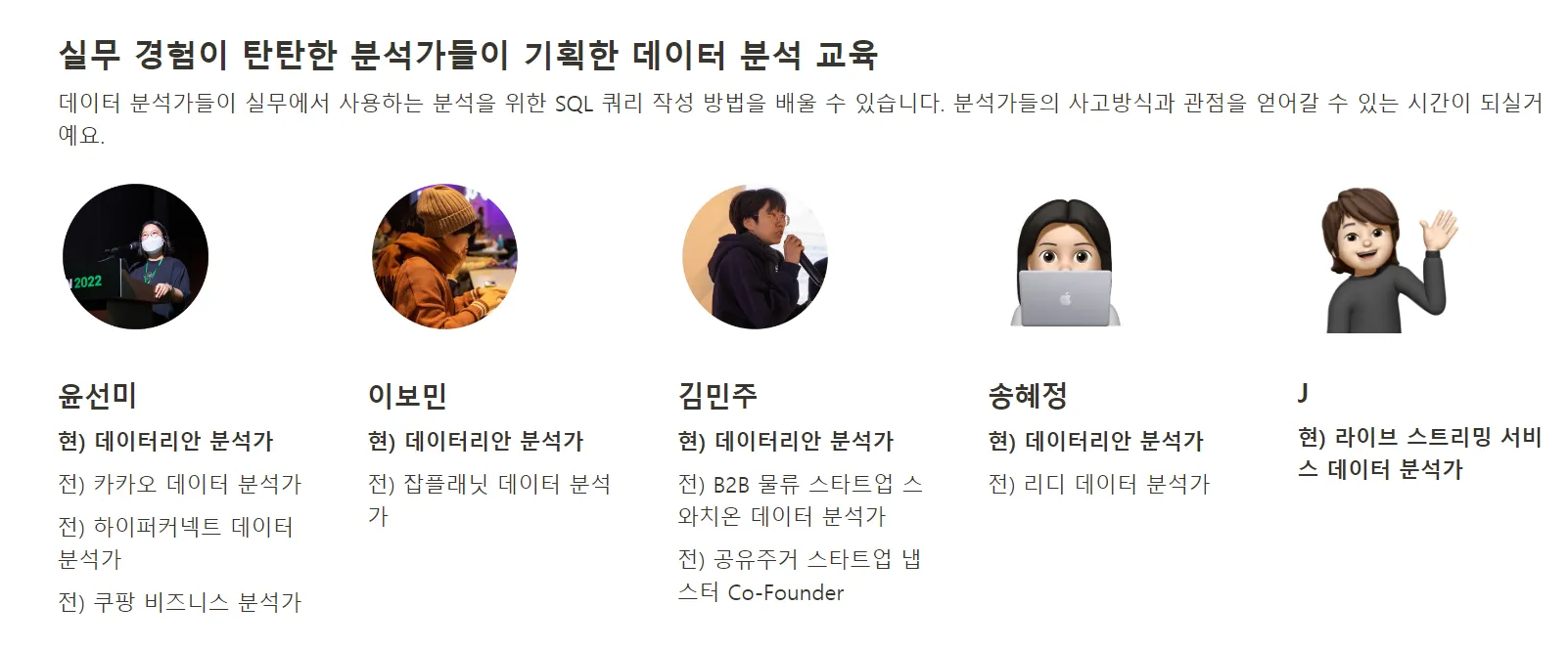 개인적으로 저는 현업에서 분석가로 일을 해본 입장에서 이런 일들이 매번 반복되는 게 눈에 보여서 참 안타까웠습니다. 멤버들 사이에도 이런 문제에 대한 공감대가 있어서 ‘우리는 진짜 실무에서 사용할 수 있는 교육으로 사업을 해보자’라는 이야기를 할 수 있었고, 덕분에 지금의 SQL 데이터 분석 캠프가 탄생할 수 있었어요.