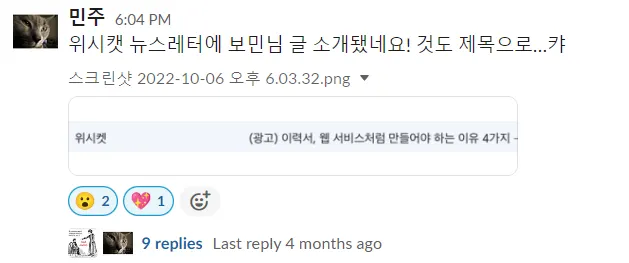 이 글은 요즘IT라는 외부 플랫폼에도 중복 기고가 되었는데요. 제 글 전후로 플랫폼에 업로드되었던 글들 중 가장 높은 뷰 수를 가진 글은 5천 5백 뷰인데요. 제 글의 뷰 수는 1만 3천이 넘었답니다. 해당 플랫폼에서 인기 게시글로 선정되어 요즘IT 운영사인 위시켓 뉴스레터에 소개되기도 했어요.